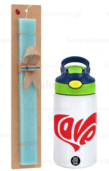 Love, Easter Set, Children's thermal stainless steel bottle with safety straw, green/blue (350ml) & aromatic flat Easter candle (30cm) (TURQUOISE)