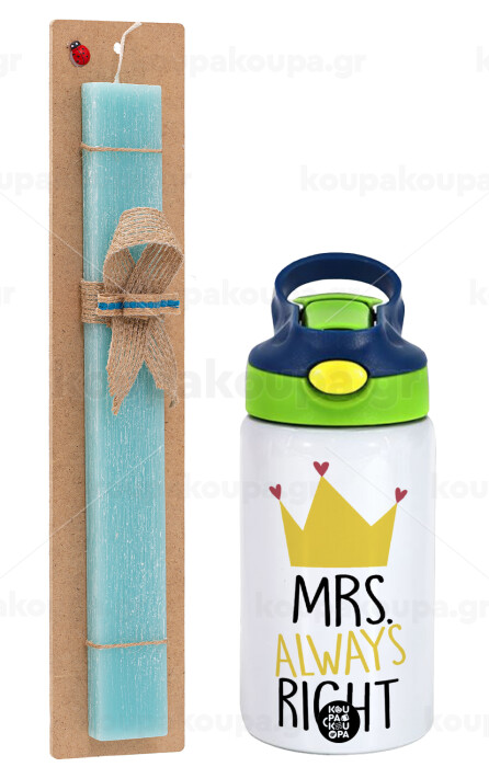 Mrs "Always" right, Easter Set, Children's thermal stainless steel bottle with safety straw, green/blue (350ml) & aromatic flat Easter candle (30cm) (TURQUOISE)