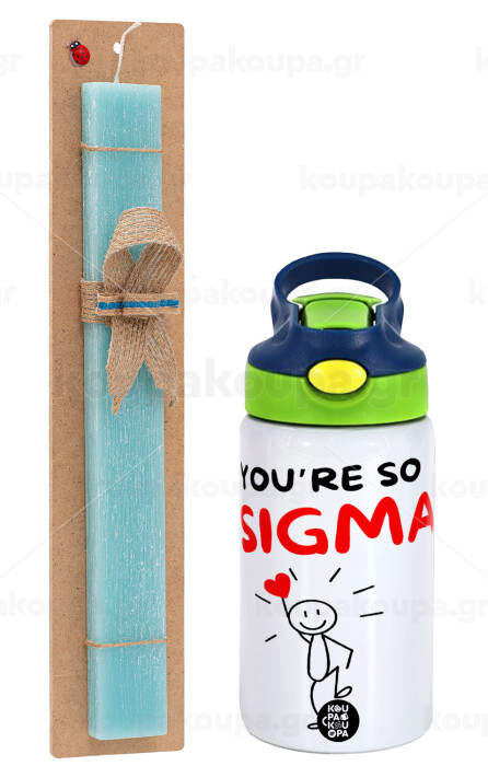 Sigma Valentine's Day , Easter Set, Children's thermal stainless steel bottle with safety straw, green/blue (350ml) & aromatic flat Easter candle (30cm) (TURQUOISE)