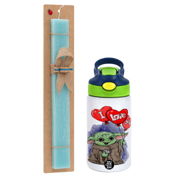 Yoda, i love you, Easter Set, Children's thermal stainless steel bottle with safety straw, green/blue (350ml) & aromatic flat Easter candle (30cm) (TURQUOISE)