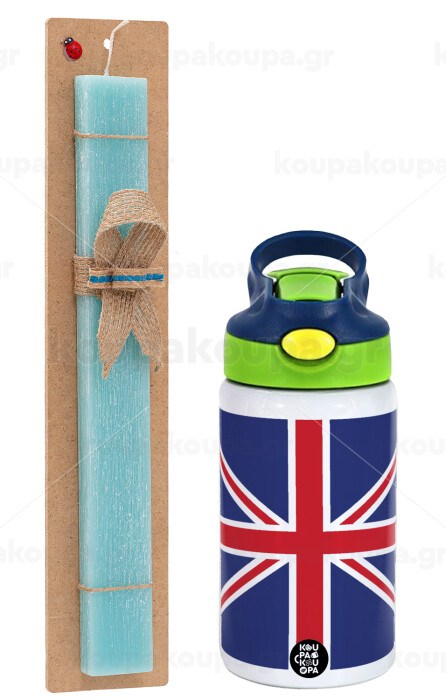 UK Flag, Easter Set, Children's thermal stainless steel bottle with safety straw, green/blue (350ml) & aromatic flat Easter candle (30cm) (TURQUOISE)
