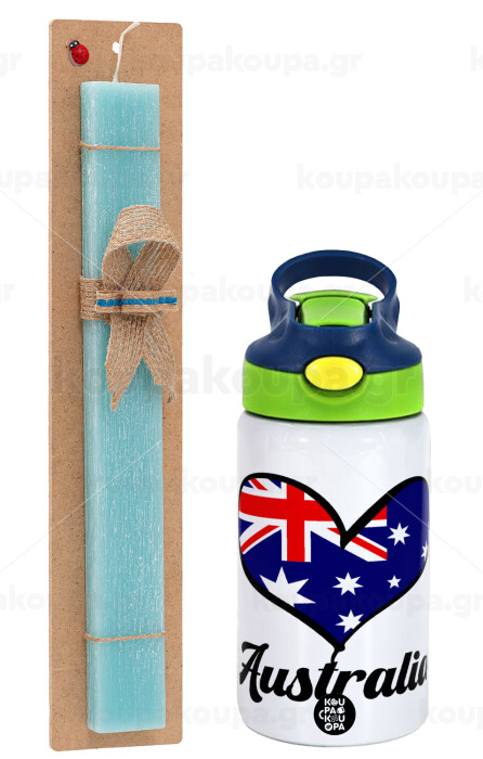 Australia flag, Easter Set, Children's thermal stainless steel bottle with safety straw, green/blue (350ml) & aromatic flat Easter candle (30cm) (TURQUOISE)