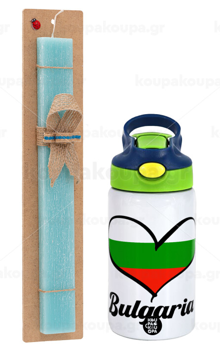 Bulgaria flag, Easter Set, Children's thermal stainless steel bottle with safety straw, green/blue (350ml) & aromatic flat Easter candle (30cm) (TURQUOISE)