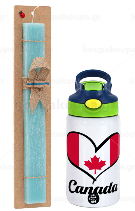Canada flag, Easter Set, Children's thermal stainless steel bottle with safety straw, green/blue (350ml) & aromatic flat Easter candle (30cm) (TURQUOISE)