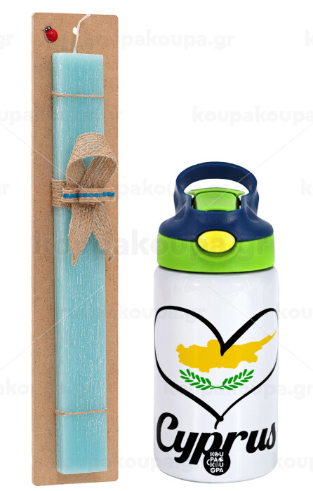Cyprus flag, Easter Set, Children's thermal stainless steel bottle with safety straw, green/blue (350ml) & aromatic flat Easter candle (30cm) (TURQUOISE)