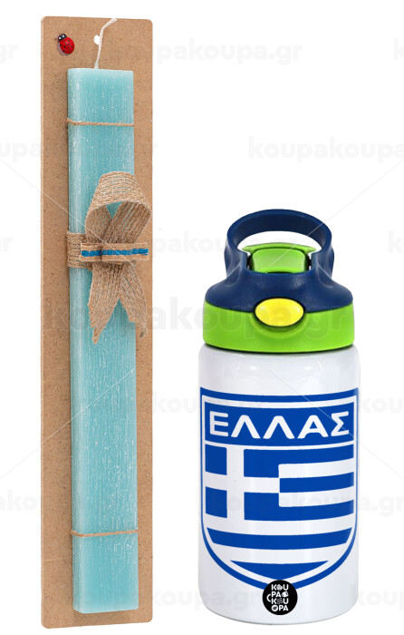 Hellas, Easter Set, Children's thermal stainless steel bottle with safety straw, green/blue (350ml) & aromatic flat Easter candle (30cm) (TURQUOISE)