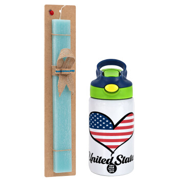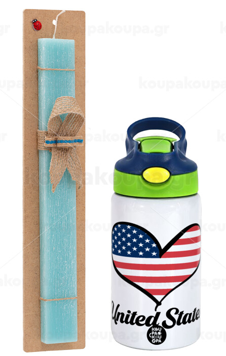 USA flag, Easter Set, Children's thermal stainless steel bottle with safety straw, green/blue (350ml) & aromatic flat Easter candle (30cm) (TURQUOISE)