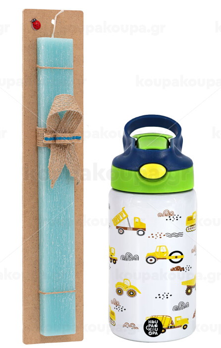 Car construction, Easter Set, Children's thermal stainless steel bottle with safety straw, green/blue (350ml) & aromatic flat Easter candle (30cm) (TURQUOISE)