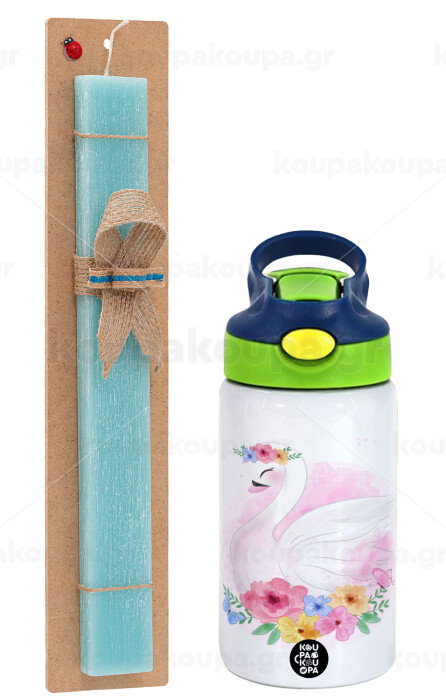 White swan, Easter Set, Children's thermal stainless steel bottle with safety straw, green/blue (350ml) & aromatic flat Easter candle (30cm) (TURQUOISE)