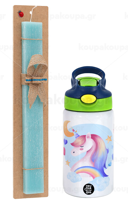 Cute unicorn, Easter Set, Children's thermal stainless steel bottle with safety straw, green/blue (350ml) & aromatic flat Easter candle (30cm) (TURQUOISE)
