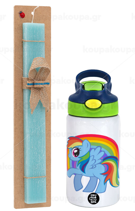 My Little Pony, Easter Set, Children's thermal stainless steel bottle with safety straw, green/blue (350ml) & aromatic flat Easter candle (30cm) (TURQUOISE)