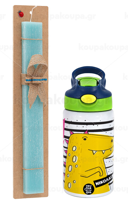t-rex , Easter Set, Children's thermal stainless steel bottle with safety straw, green/blue (350ml) & aromatic flat Easter candle (30cm) (TURQUOISE)