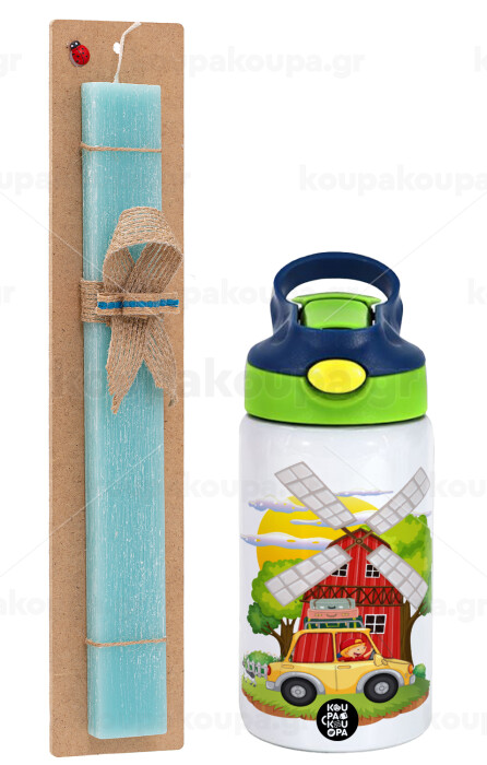 Toy car, Easter Set, Children's thermal stainless steel bottle with safety straw, green/blue (350ml) & aromatic flat Easter candle (30cm) (TURQUOISE)