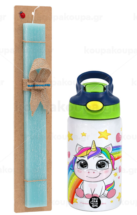 Unicorn baby με όνομα, Easter Set, Children's thermal stainless steel bottle with safety straw, green/blue (350ml) & aromatic flat Easter candle (30cm) (TURQUOISE)