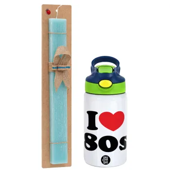 I Love 80s, Easter Set, Children's thermal stainless steel bottle with safety straw, green/blue (350ml) & aromatic flat Easter candle (30cm) (TURQUOISE)