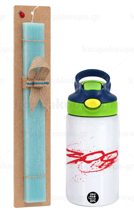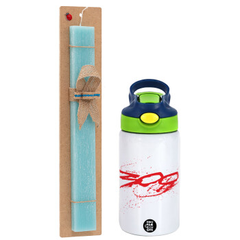 Οι 300 της Σπάρτης, Easter Set, Children's thermal stainless steel bottle with safety straw, green/blue (350ml) & aromatic flat Easter candle (30cm) (TURQUOISE)