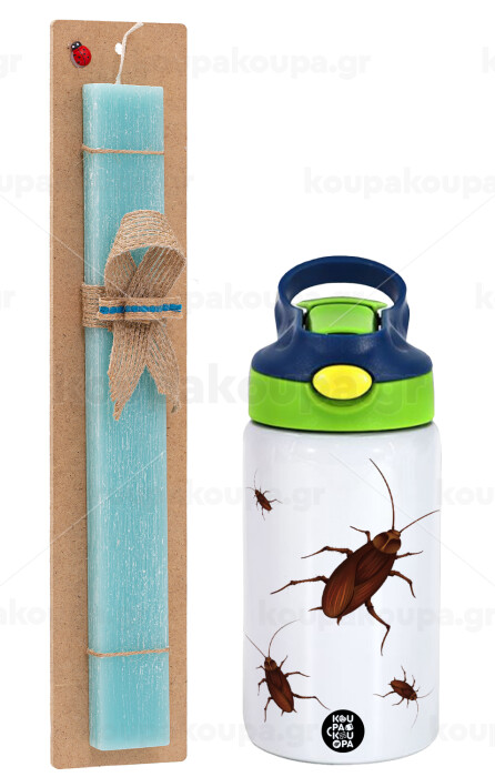 Blattodea, Easter Set, Children's thermal stainless steel bottle with safety straw, green/blue (350ml) & aromatic flat Easter candle (30cm) (TURQUOISE)