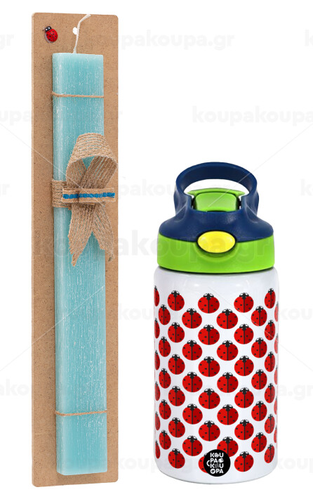 Coccinella, Easter Set, Children's thermal stainless steel bottle with safety straw, green/blue (350ml) & aromatic flat Easter candle (30cm) (TURQUOISE)
