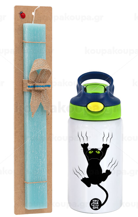 cat grabbing, Easter Set, Children's thermal stainless steel bottle with safety straw, green/blue (350ml) & aromatic flat Easter candle (30cm) (TURQUOISE)