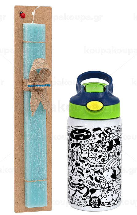 DOG pattern, Easter Set, Children's thermal stainless steel bottle with safety straw, green/blue (350ml) & aromatic flat Easter candle (30cm) (TURQUOISE)