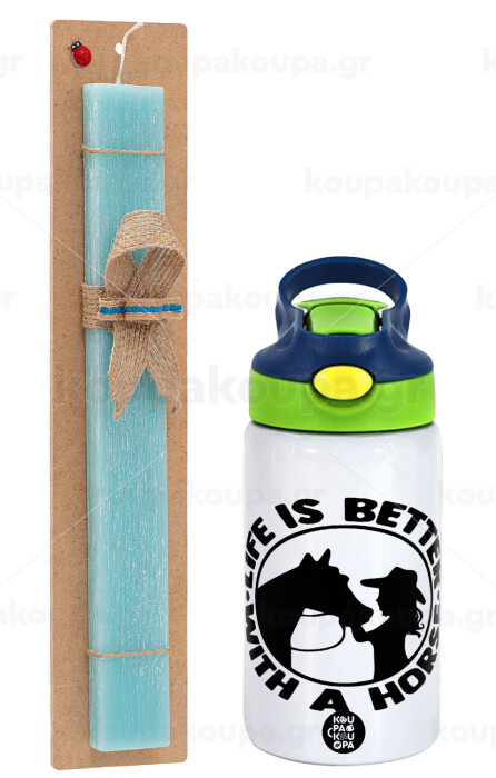 Life is Better with a Horse, Easter Set, Children's thermal stainless steel bottle with safety straw, green/blue (350ml) & aromatic flat Easter candle (30cm) (TURQUOISE)