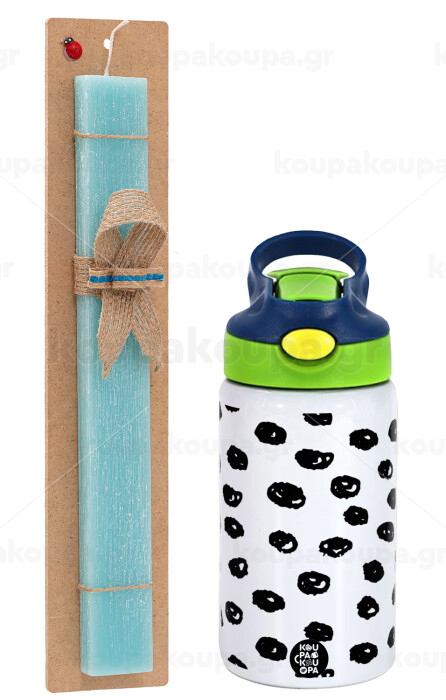 Doodle Dots, Easter Set, Children's thermal stainless steel bottle with safety straw, green/blue (350ml) & aromatic flat Easter candle (30cm) (TURQUOISE)