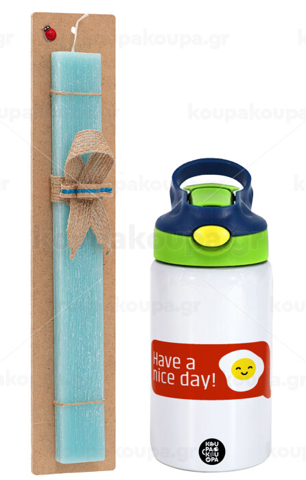 Have a nice day Emoji, Easter Set, Children's thermal stainless steel bottle with safety straw, green/blue (350ml) & aromatic flat Easter candle (30cm) (TURQUOISE)