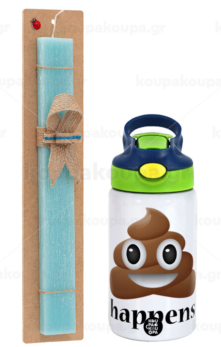 Shit Happens, Easter Set, Children's thermal stainless steel bottle with safety straw, green/blue (350ml) & aromatic flat Easter candle (30cm) (TURQUOISE)