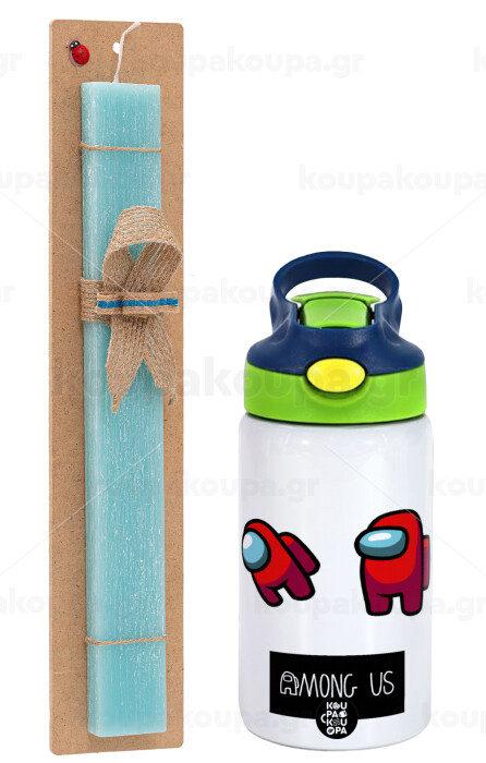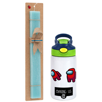 Among US, Easter Set, Children's thermal stainless steel bottle with safety straw, green/blue (350ml) & aromatic flat Easter candle (30cm) (TURQUOISE)