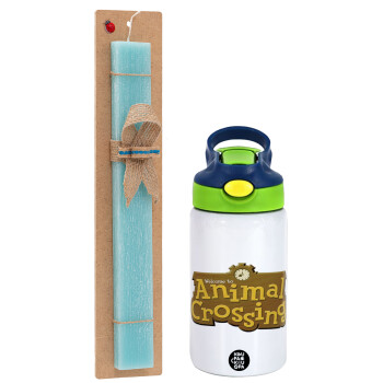 Animal Crossing, Easter Set, Children's thermal stainless steel bottle with safety straw, green/blue (350ml) & aromatic flat Easter candle (30cm) (TURQUOISE)