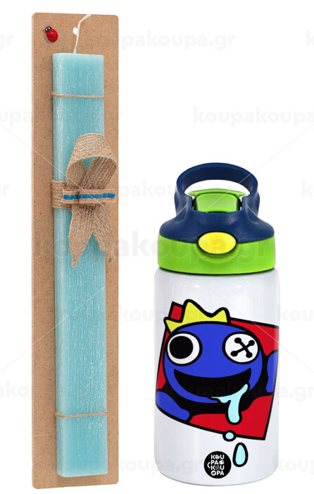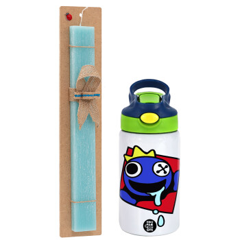 Blue, Rainbow friends, Easter Set, Children's thermal stainless steel bottle with safety straw, green/blue (350ml) & aromatic flat Easter candle (30cm) (TURQUOISE)