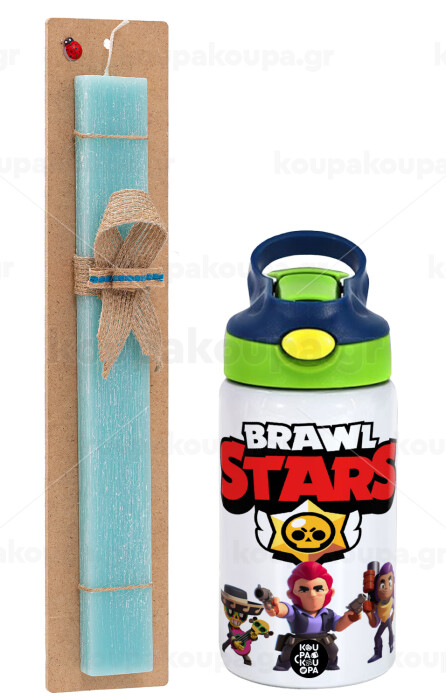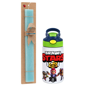 Brawl Stars Desert, Easter Set, Children's thermal stainless steel bottle with safety straw, green/blue (350ml) & aromatic flat Easter candle (30cm) (TURQUOISE)