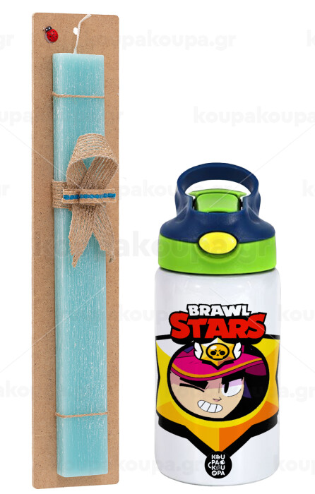 Brawl Stars Fang, Easter Set, Children's thermal stainless steel bottle with safety straw, green/blue (350ml) & aromatic flat Easter candle (30cm) (TURQUOISE)