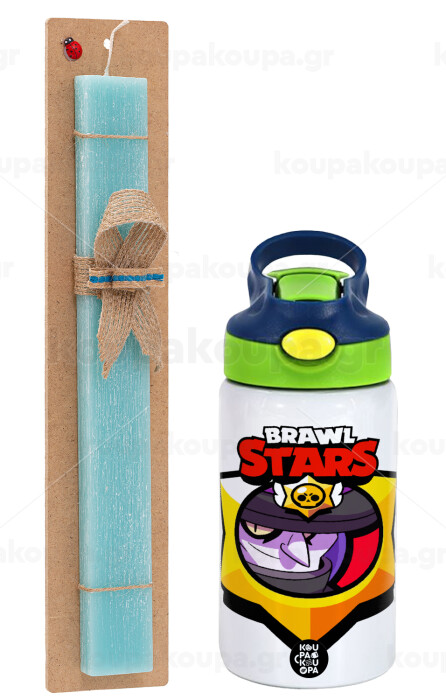 Brawl Stars Mortis, Easter Set, Children's thermal stainless steel bottle with safety straw, green/blue (350ml) & aromatic flat Easter candle (30cm) (TURQUOISE)