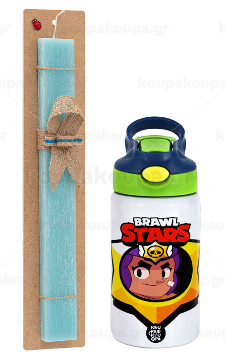 Brawl Stars Shelly, Easter Set, Children's thermal stainless steel bottle with safety straw, green/blue (350ml) & aromatic flat Easter candle (30cm) (TURQUOISE)