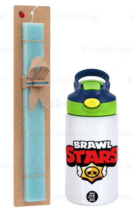 Brawl Stars, Easter Set, Children's thermal stainless steel bottle with safety straw, green/blue (350ml) & aromatic flat Easter candle (30cm) (TURQUOISE)