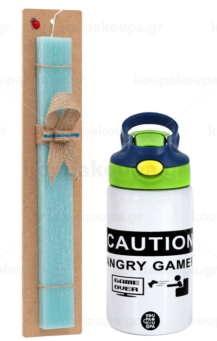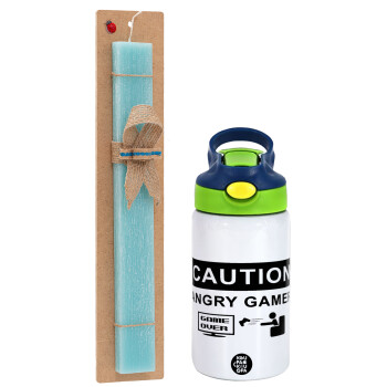Caution, angry gamer!, Easter Set, Children's thermal stainless steel bottle with safety straw, green/blue (350ml) & aromatic flat Easter candle (30cm) (TURQUOISE)