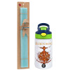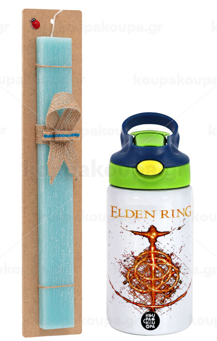 Elden Ring, Easter Set, Children's thermal stainless steel bottle with safety straw, green/blue (350ml) & aromatic flat Easter candle (30cm) (TURQUOISE)
