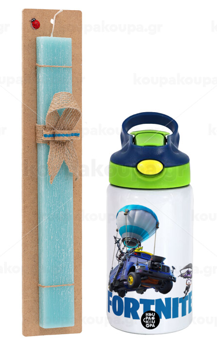 Fortnite Bus, Easter Set, Children's thermal stainless steel bottle with safety straw, green/blue (350ml) & aromatic flat Easter candle (30cm) (TURQUOISE)