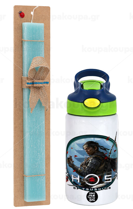 Ghost of Tsushima, Easter Set, Children's thermal stainless steel bottle with safety straw, green/blue (350ml) & aromatic flat Easter candle (30cm) (TURQUOISE)