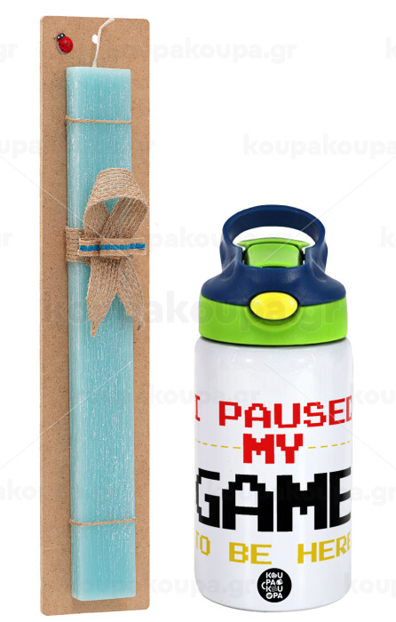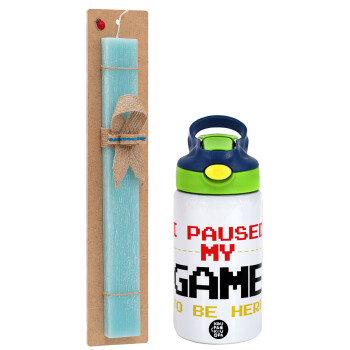 I paused my game to be here, Easter Set, Children's thermal stainless steel bottle with safety straw, green/blue (350ml) & aromatic flat Easter candle (30cm) (TURQUOISE)