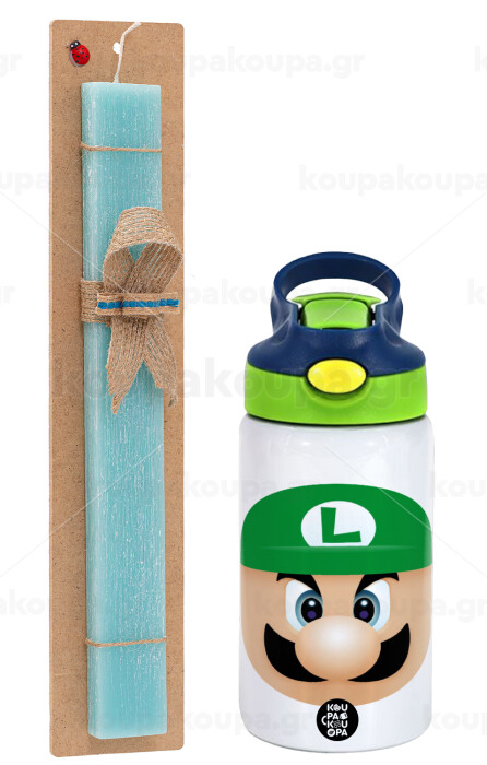 Luigi flat, Easter Set, Children's thermal stainless steel bottle with safety straw, green/blue (350ml) & aromatic flat Easter candle (30cm) (TURQUOISE)