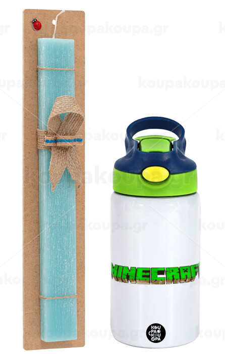Minecraft logo green, Easter Set, Children's thermal stainless steel bottle with safety straw, green/blue (350ml) & aromatic flat Easter candle (30cm) (TURQUOISE)
