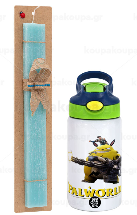 Palworld, Easter Set, Children's thermal stainless steel bottle with safety straw, green/blue (350ml) & aromatic flat Easter candle (30cm) (TURQUOISE)