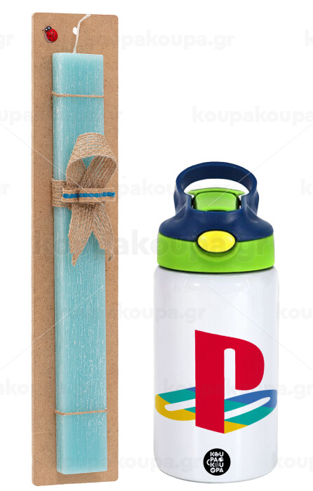 Playstation, Easter Set, Children's thermal stainless steel bottle with safety straw, green/blue (350ml) & aromatic flat Easter candle (30cm) (TURQUOISE)
