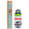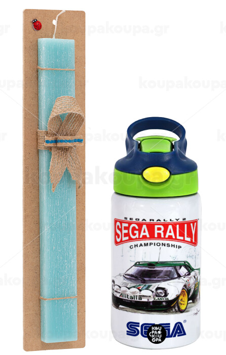 SEGA RALLY 2, Easter Set, Children's thermal stainless steel bottle with safety straw, green/blue (350ml) & aromatic flat Easter candle (30cm) (TURQUOISE)