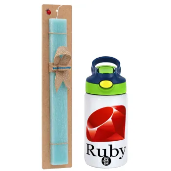 Ruby, Easter Set, Children's thermal stainless steel bottle with safety straw, green/blue (350ml) & aromatic flat Easter candle (30cm) (TURQUOISE)