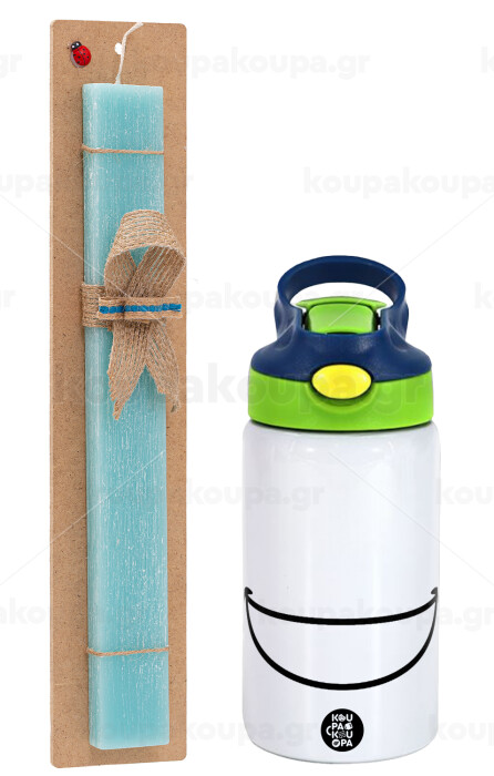 Big Smile, Easter Set, Children's thermal stainless steel bottle with safety straw, green/blue (350ml) & aromatic flat Easter candle (30cm) (TURQUOISE)