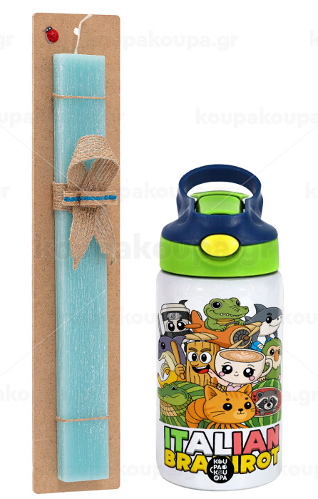 Italian Brainrot friends, Easter Set, Children's thermal stainless steel bottle with safety straw, green/blue (350ml) & aromatic flat Easter candle (30cm) (TURQUOISE)