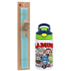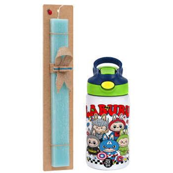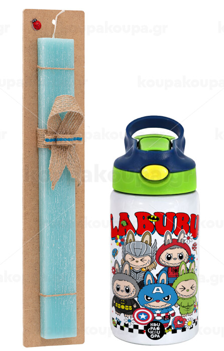 Labubu superheroes, Easter Set, Children's thermal stainless steel bottle with safety straw, green/blue (350ml) & aromatic flat Easter candle (30cm) (TURQUOISE)